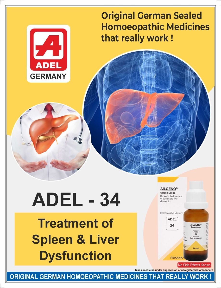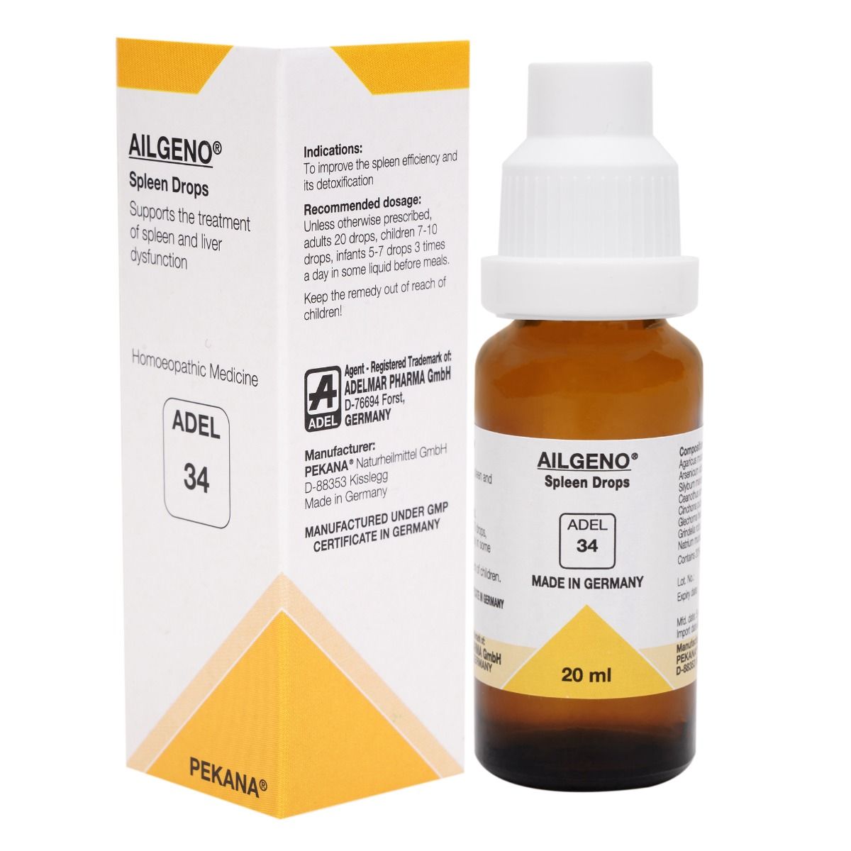 ADEL 34 Ailgeno Drop specifically stimulates and detoxifies the spleen to eliminate focal infections and old deposits of toxins. It stimulates the entire metabolism. The few homoeopathic combinations in ADEL 34 treat spleen dysfunction and intoxication, although this organ plays a vital role in immune system response.
