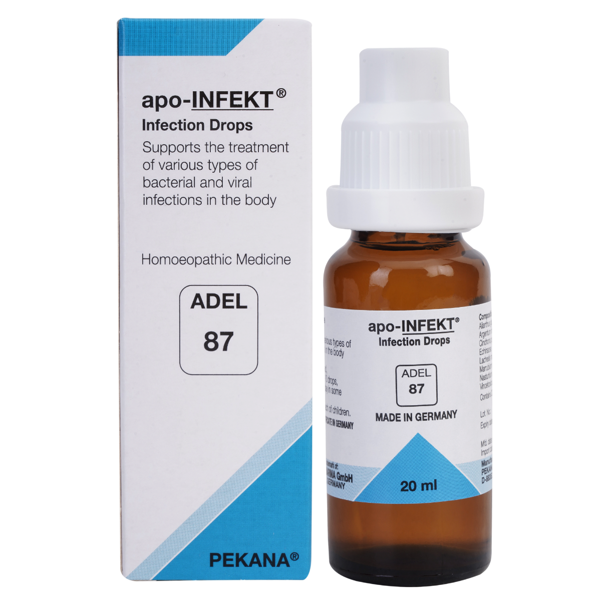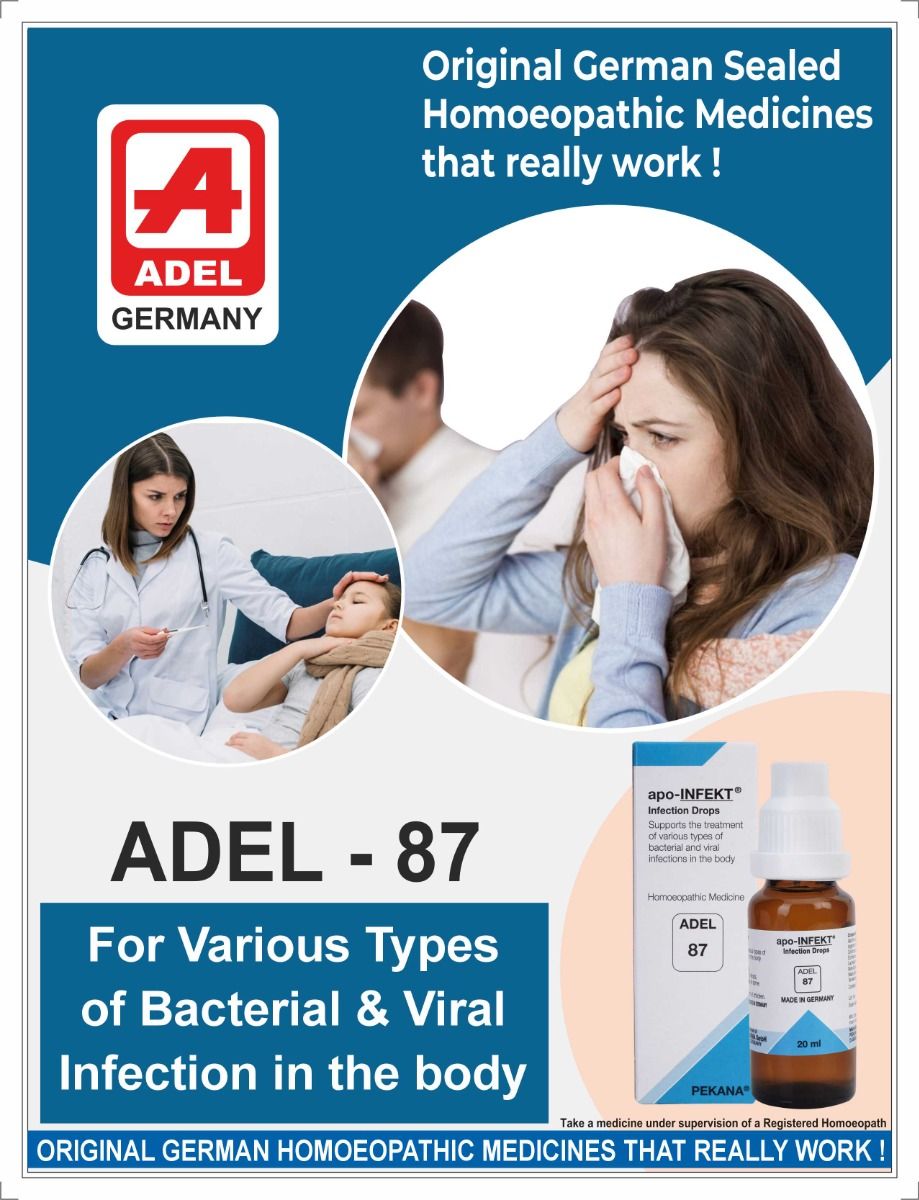 Acute bacterial and viral infections can be treated succesfully with the help of ADEL 87 (apo-INFEKT) drops, which work as an immune system stimulant and biological antimicrobial to eliminate pathogens. The antimicrobial qualities are essential for treatment of acute infections of the bladder, kidneys, bronchials and other organs. All pus-producing infection such as bronchitis, tonsillitis and otitis media indicate the need for ADEL 87 drops, which also stimulate the lymphatic system and address and accompanying symptoms such as fever and weakness. In addition ADEL 87 drops treat intestinal tract infections to help neutralize toxins.