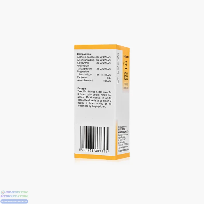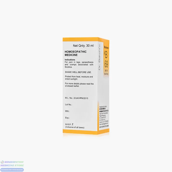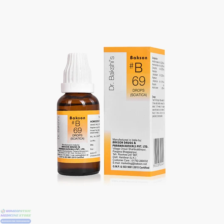 Bakson B69 Sciatica Drop is a homoeopathic formulation specially designed to help relieve shooting pain, numbness, tingling, and stiffness that radiates from the lower back down to the legs — common symptoms of sciatica. It supports the nerves, reduces inflammation, eases muscle tension, and promotes comfortable mobility. Ideal for people suffering from chronic or acute sciatic nerve pain.
