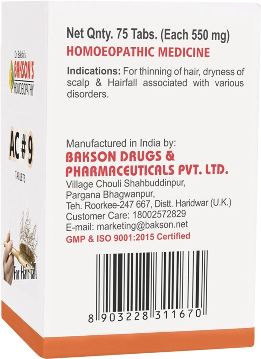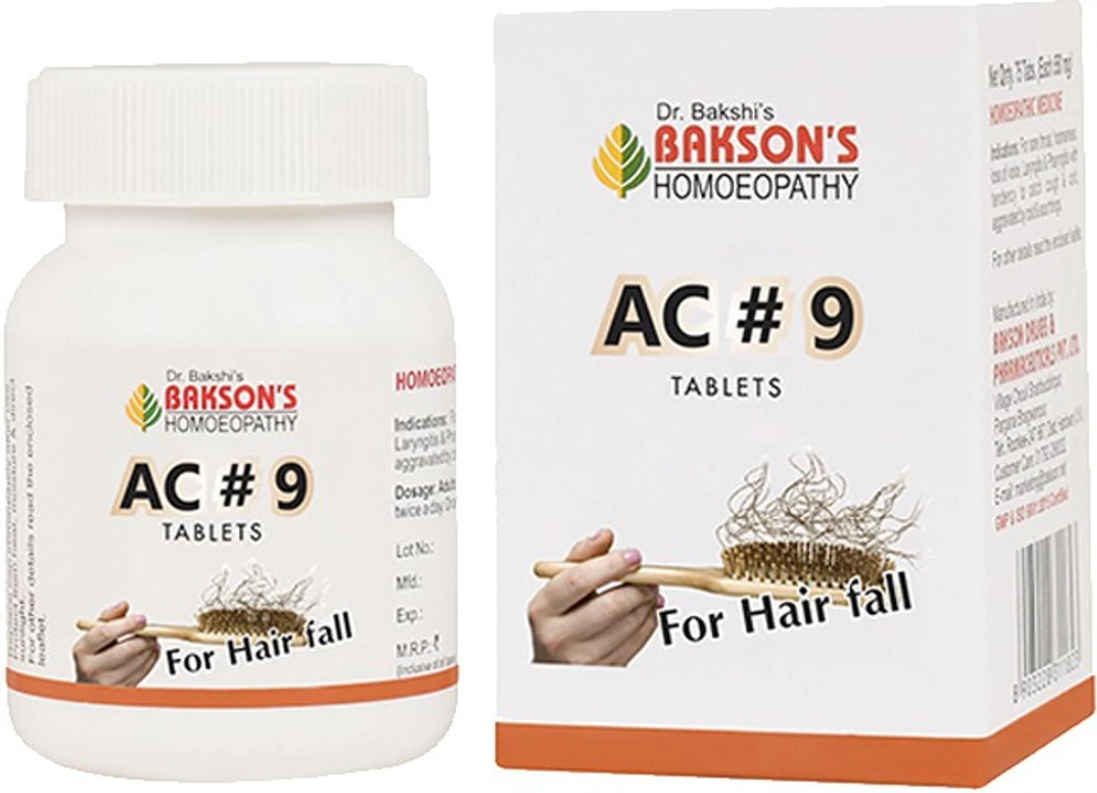 AC#9 Tablets by Bakson Homeopathy provides effective support for hair fall, weak roots and reduction in hair volume. Its unique combination of homeopathic actives helps improve scalp health, promote blood circulation and encourage regrowth of stronger, smoother hair. Suitable for men and women, this safe and natural formulation offers a holistic approach to maintain hair vitality with regular use.