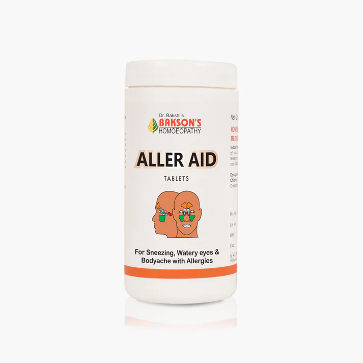 Bakson’s Aller Aid Tablet is homeopathic tablet for allergy which provides relief from hay fever without any side effects. These tablet for allergies do not cause any drowsiness or disturbance in daily routine. Aller Aid tablets are helpful against runny nose, sneezing, watery eyes, sinus congestion (sinusitis), fever and body ache due to allergies and hay fever. Aller Aid Tablet contains Natrum Muriaticum and Ferrum Phosphoricum which helps in providing relief from sneezing, headache, sore throat, aches and pains all over the body and severe tiredness.