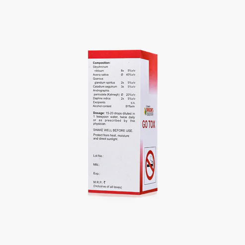 Bakson’s Homeopathy Go Tox Drop is a formulation aimed at combating the adverse effects of alcohol and nicotine consumption. Enriched with a blend of natural ingredients like strychninum nitricum, avena sativa, quercus glandium spiritus, caladium seguinum, andrographis paniculata, and daphne indica, this homoeopathic remedy offers a holistic approach towards reducing cravings, detoxifying the body, and alleviating the aftereffects of substance abuse.