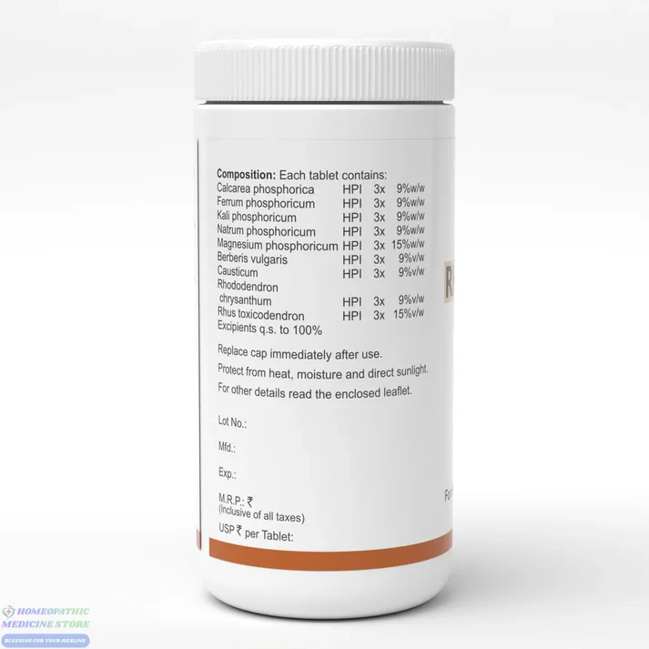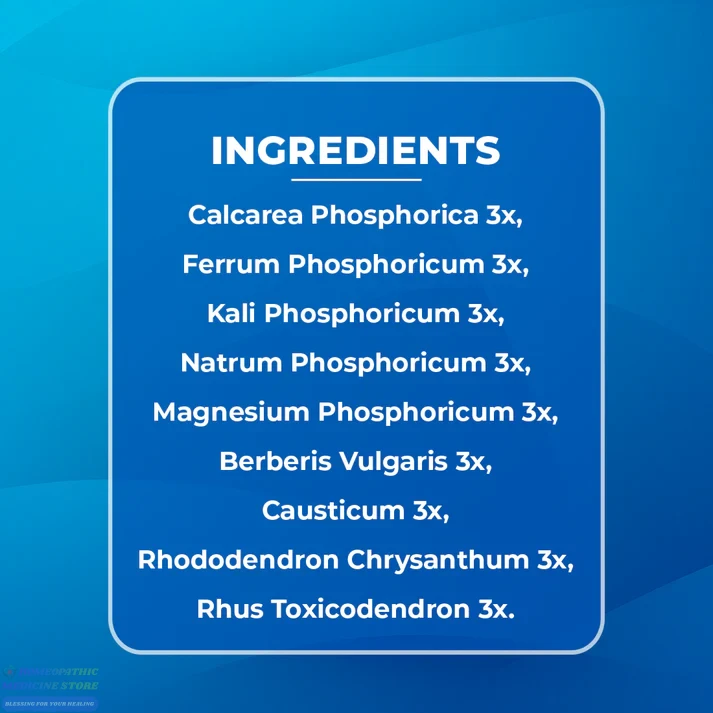 Calcarea Phosphorica 3x, Ferrum Phosphorica 3x, Kali Phosphoricum 3x, Natrum Phosphoricum 3x, Magnesium Phosphoricum 3x, Berberis Vulgaris 3x, Causticum 3x, Rhododendron Chrysanthum 3x, Rhus Toxicodendron 3x