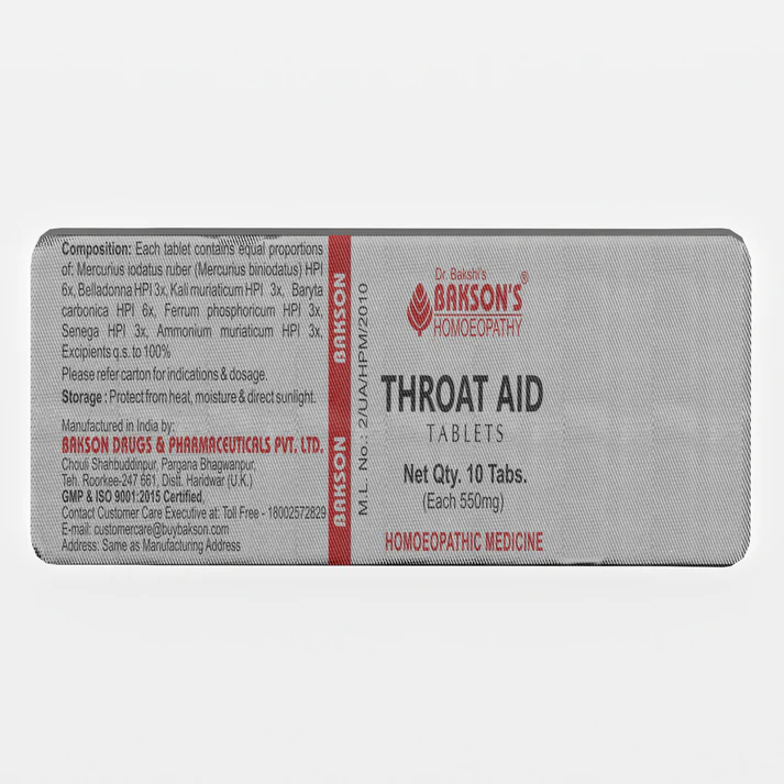 Bakson’s Homeopathy Throat Aid Tablets is a gentle homeopathic remedy formulated to relieve sore throat, hoarseness, loss of voice and inflammation of the throat (pharyngitis/laryngitis). It helps soothe irritation, support vocal clarity, and ease throat discomfort.