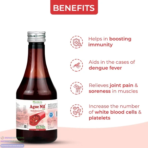 Bhargava Ague Nil Immunity Syrup strengthens the immune system and aids in the cases of dengue fever. As an effective immunity booster, it helps increase the number of white blood cells and platelets, which help fight bacteria and reduce inflammation. This immunity syrup is designed to provide vital support to your body’s defense system, especially during illness or infection.